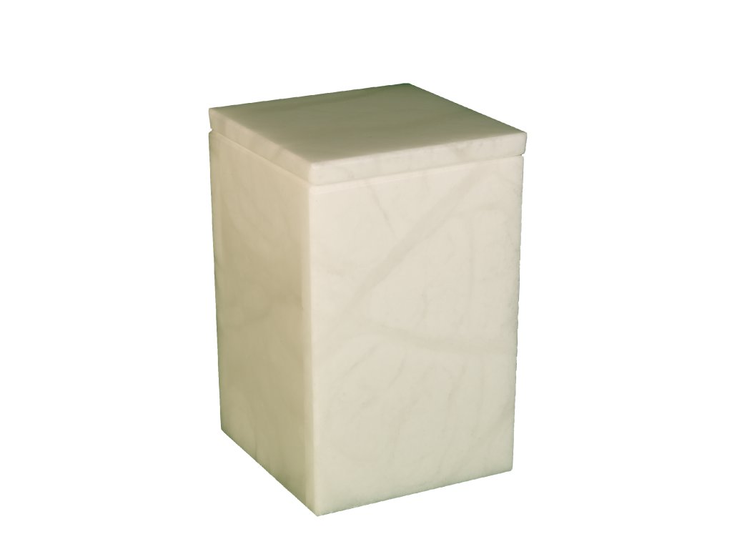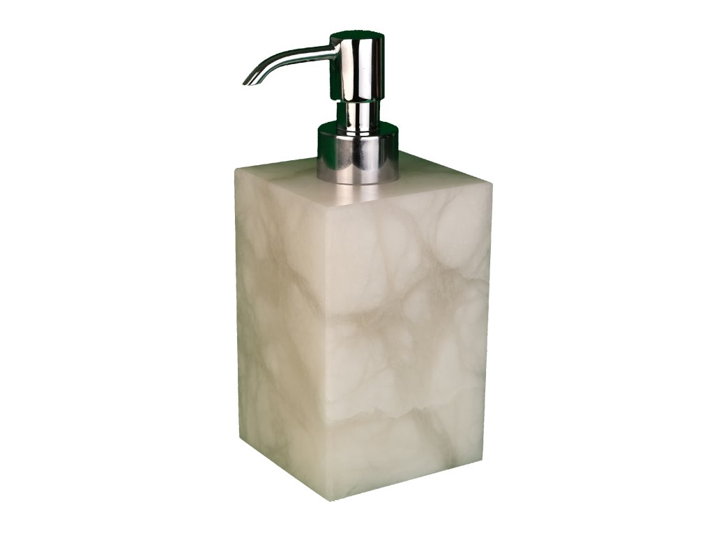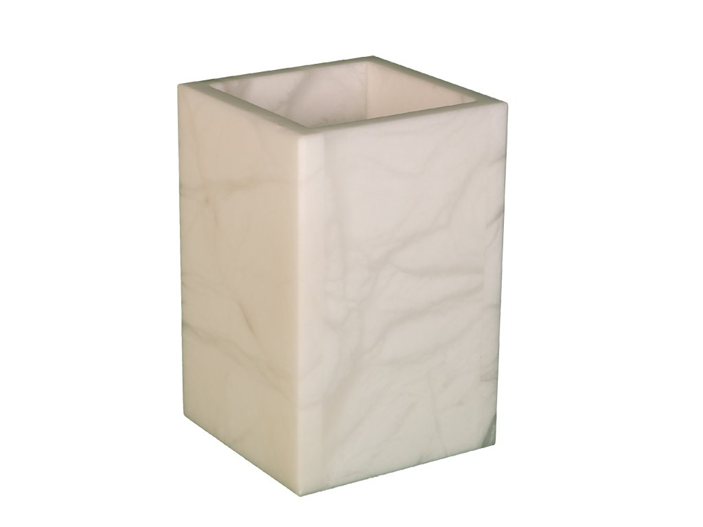 Koupelnový set Bianco z bílého alabastru. Obsahuje dávkovač na tekuté mýdlo, nádobu na zubní kartáčky, uzavíratelnou nádobu na drobné doplňky a mýdlenku.