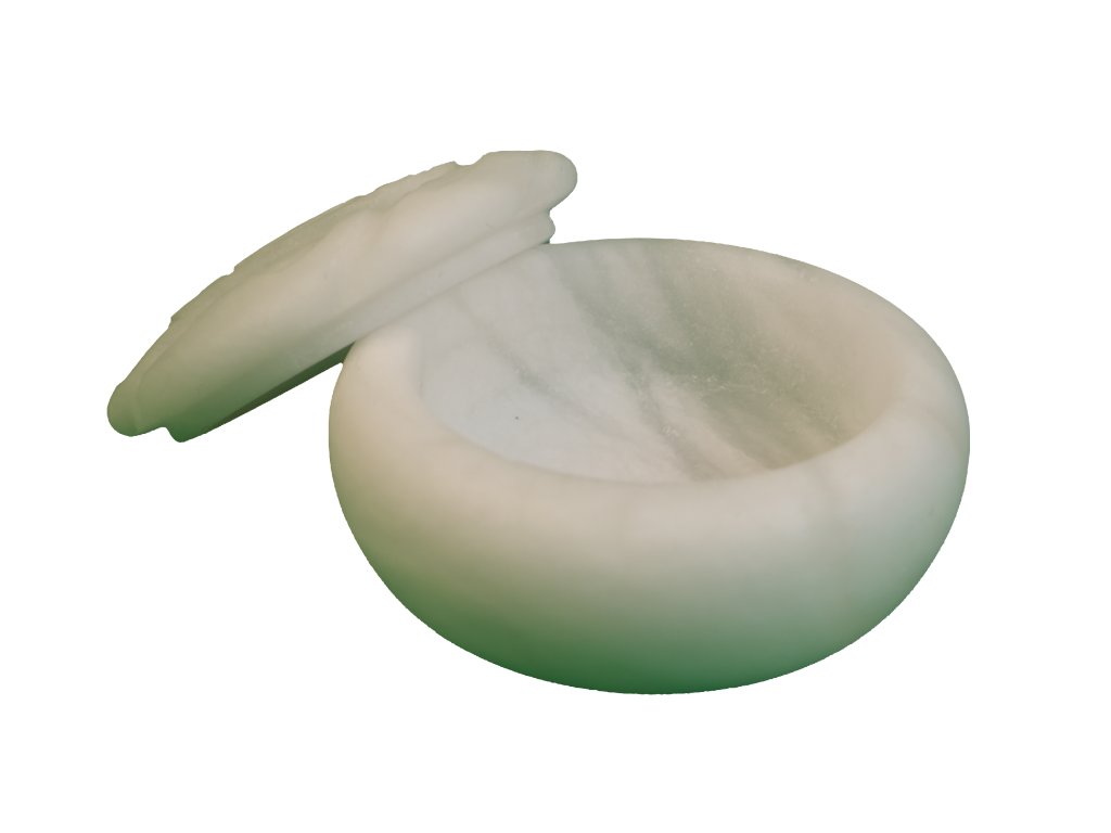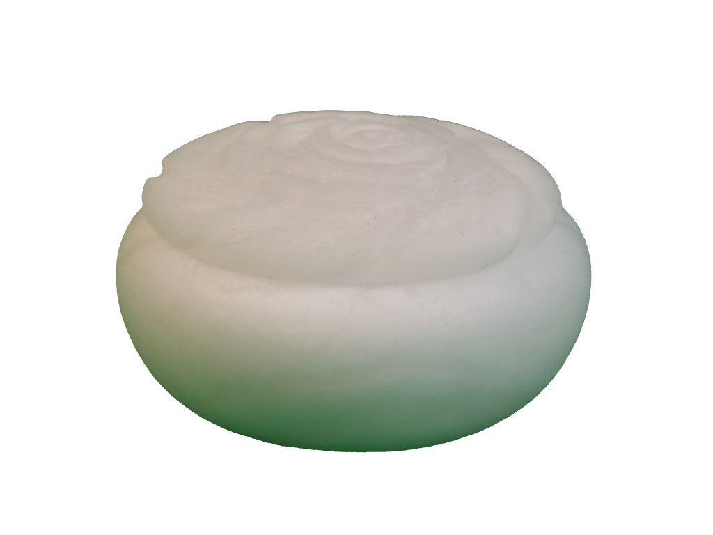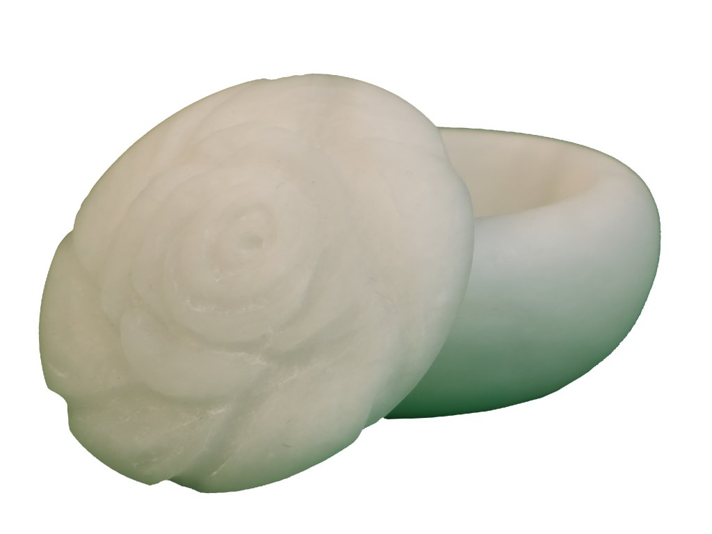 Malá dóza z bílého alabastru s motivem růže na víku.